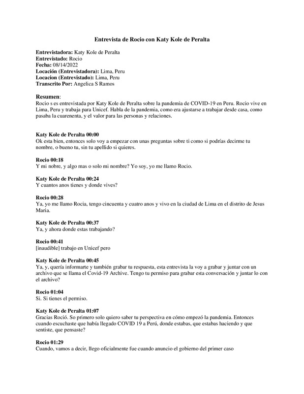 Rocio s es entrevistada por Katy Kole de Peralta sobre la pandemia de COVID-19 en Peru. Rocio vive en Lima, Peru y trabaja para Unicef. Habla de la pandemia, como era ajustarse a trabajar desde casa, como pasaba la cuarenenta, y el valor para las personas y relaciones.