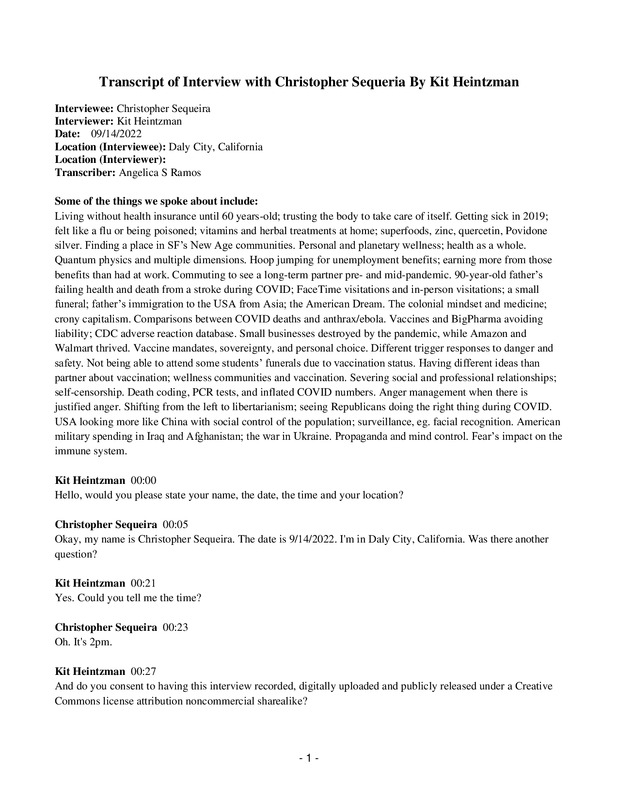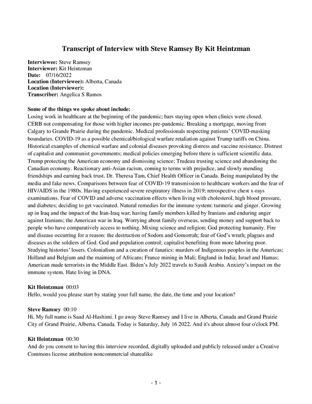 En esta entrevista Javier Hernández Echeverria es entrevistado por Carmen Kordick Coury concerniente al covid-19 en Costa Rica. Para empezar, hablan de la primera ves que Javier se dio cuenta de la pandemia, de cómo se sintió y sus preocupaciones. Habla de su hogar y las formas en que su vida ha cambiado, también habla de su trabajo de ingeniero agrónomo. De allí, hablan de la economía, de su familia y comunidad. Hablan del gobierno, cambios en su barrio y el uso de las mascarillas. También hablan de gente conocida que se han enfermado, gente que aun viajan y las fronteras cerradas. Para terminar, hablan de las fuentes principales desinformación, corrupción del gobierno y cambios en como ve su familia sus amigos y su comunidad.