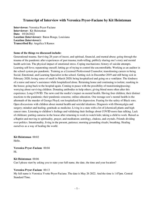 Self Description: "Well, my name is Veronica. And I am the mother of four. And I'm married. I went through a lot of trauma growing up. So to be introduced, another traumatic experience shows the resilience that has been cultivated me over time."
