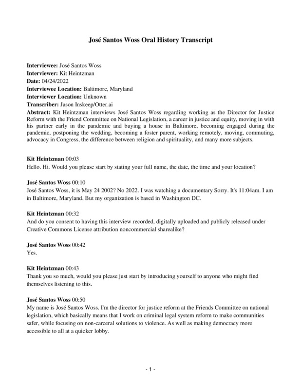 Self Description: "My name is José Santos Woss. I'm the director for justice reform at the Friends Committee on national legislation, which basically means that I work on criminal legal system reform to make communities safer, while focusing on non-carceral solutions to violence. As well as making democracy more accessible to all at a quicker lobby."
