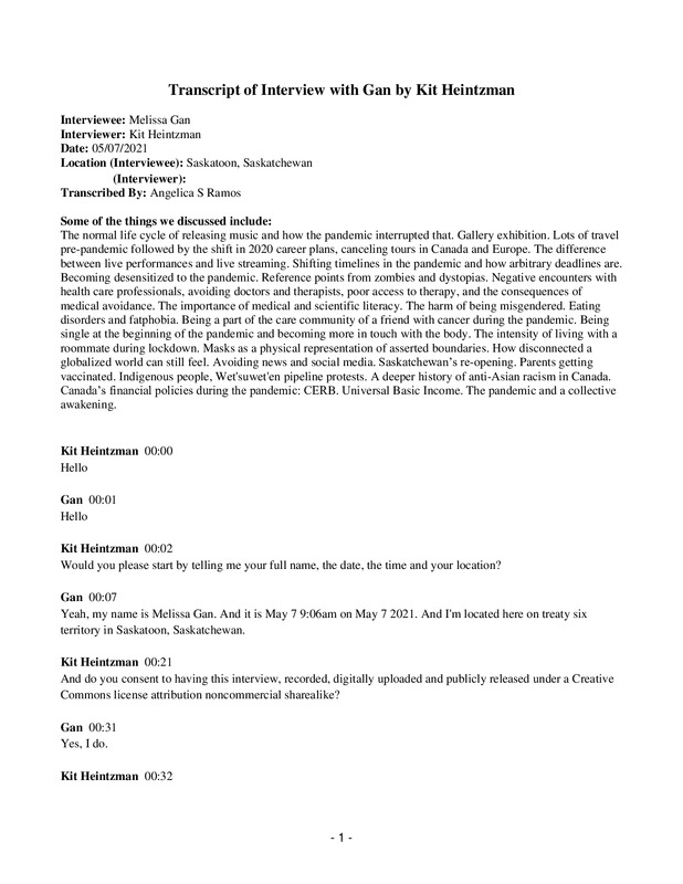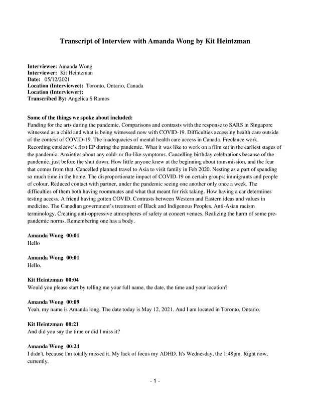 Self Description: “I’m a 21-year-old musician. I just recently graduated from U[niversity] of T[oronto] a week ago, and I graduated with a classical percussion degree. I play for a band called cutsleeve. We’re a group of east Asian, queer sound musicians. I’m a mixed race woman, my father is white, and my mother is Chinese. I’ve lived in Canada, the [United] States, and I lived in Shanghai for a few years. I’m a dog owner.”