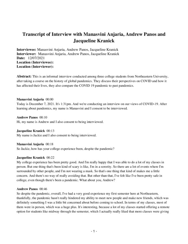 This is a casual interview about the effects of COVID on mental health, academics, family life, etc. We discuss the biggest impact COVID had on us, our experience with the pandemic, what we did over quarantine, and much more, from the perspective of college freshmen.
