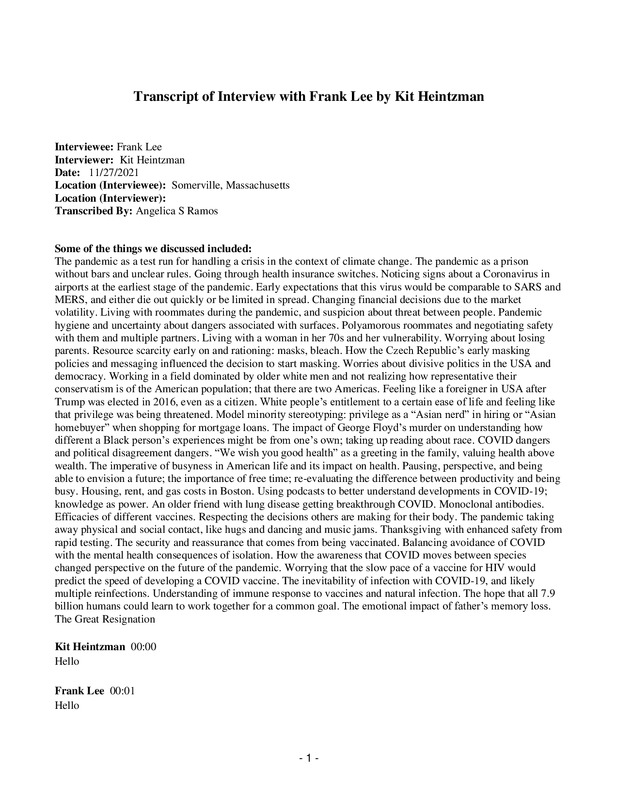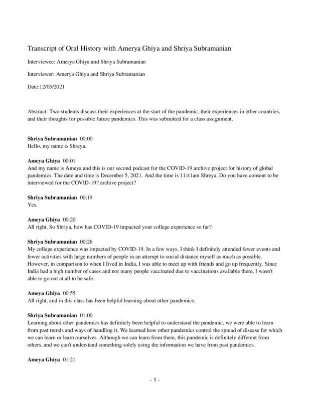 [Curator's Note] Two persons interview each other about their experiences during the COVIS-19 pandemic. They both lived in different countries when the pandemic started, as one of them lives in Singapore and the other in India.
