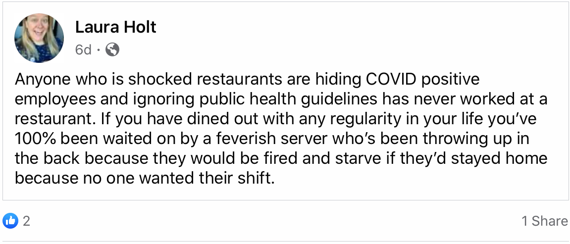 This meme created from a Facebook post has been making the rounds among food industry people. It's a well-known secret that food workers don't take sick days so why would they start now? If you've ever worked in food service you know you don't call in sick even when you are violating food safety rules. It's hard to find a job in food service, it's even harder to keep that job, and you can't afford to lose that job.