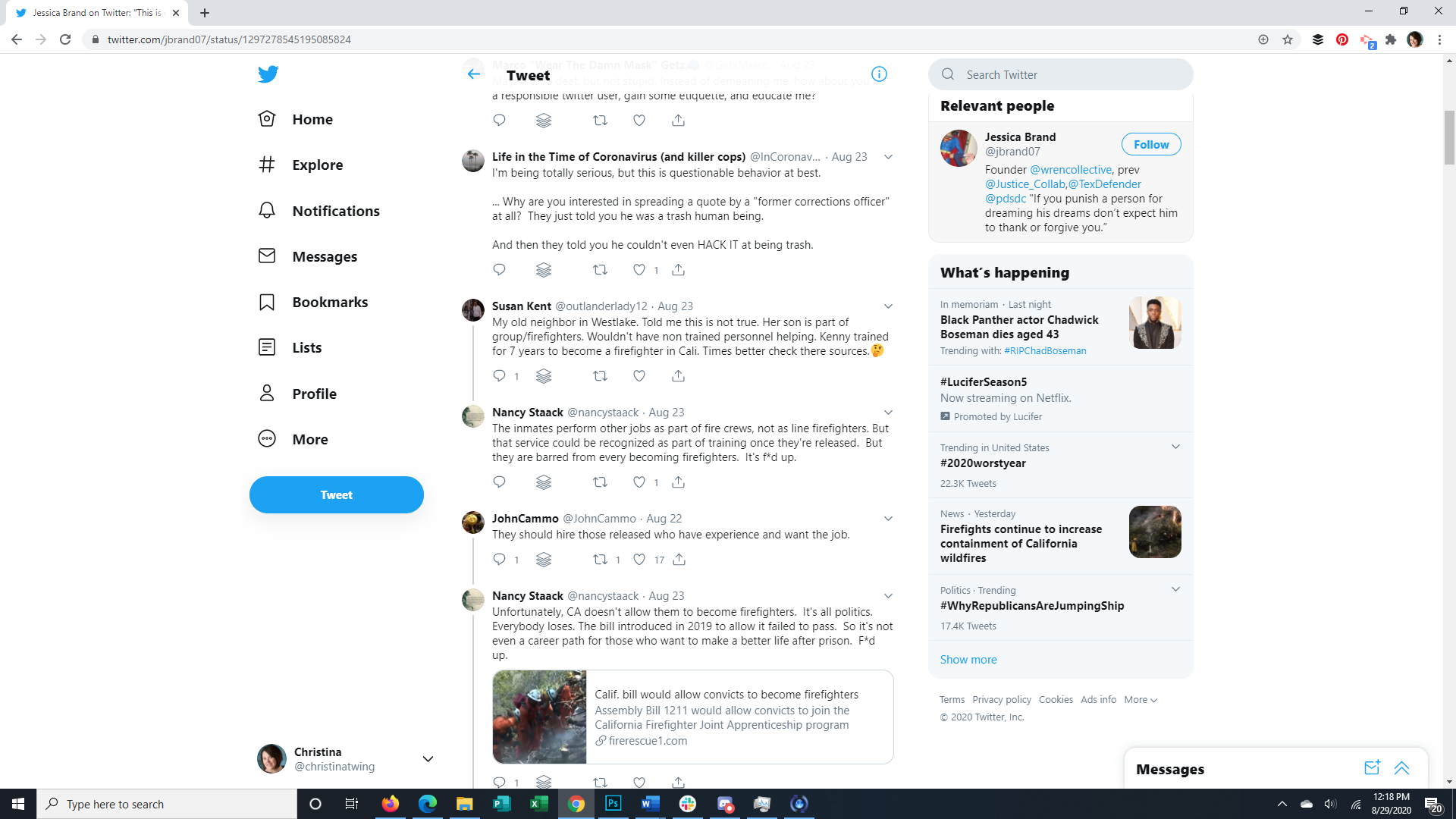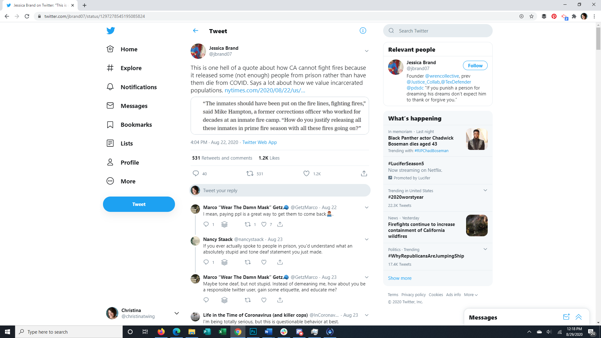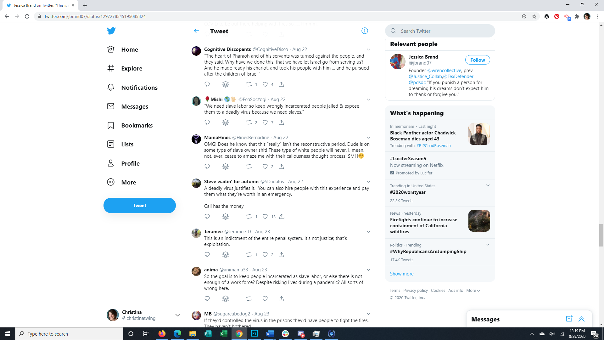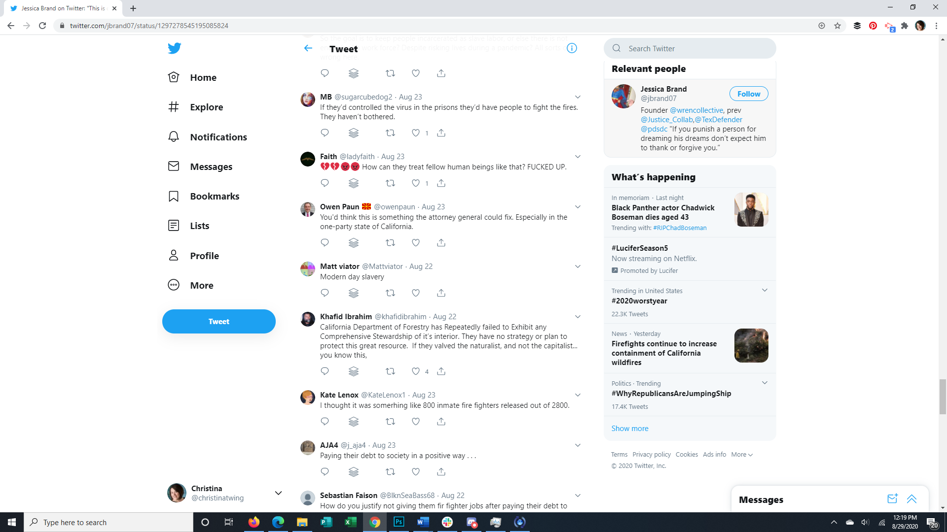 In an effort to slow the spread of Covid-19 incarceration facilities across the nation have released a small number of people earlier than they would have been otherwise. This has created a unique situation in California, a state that relies on prison labor to combat wildfires every year. As the writer of this Tweet calls out, much of the general public and the nation's politicians believe "if you do the crime, you do the time" and feel this extends to using inmates for fighting fires.