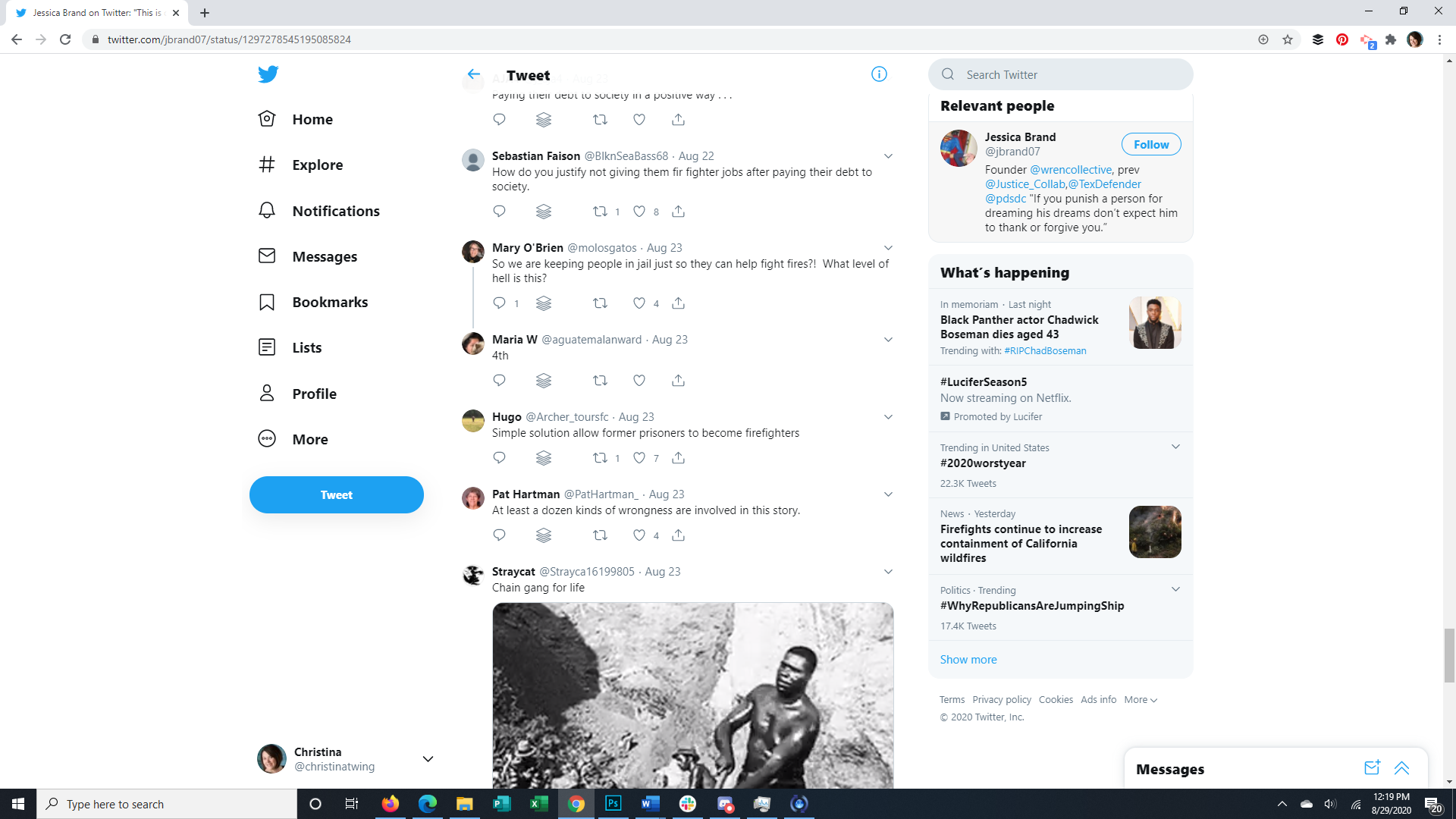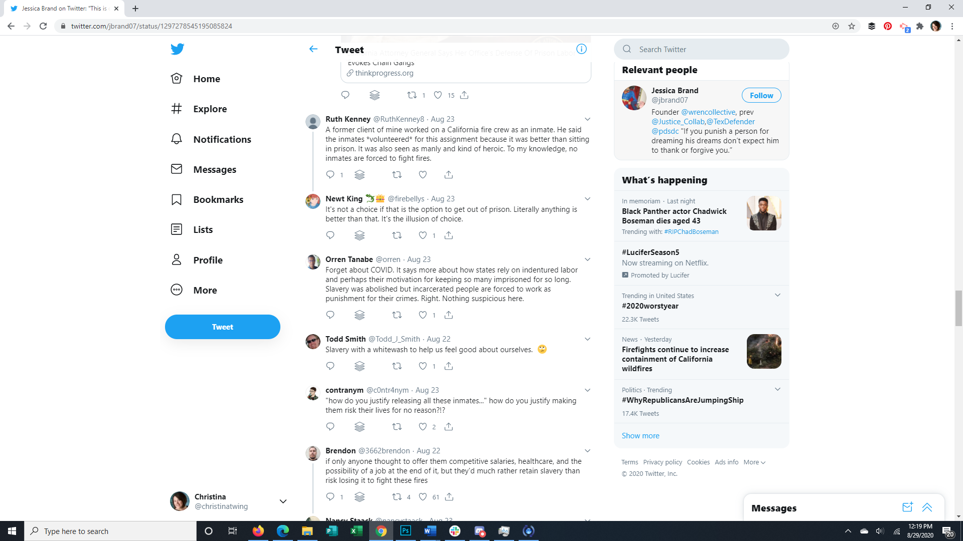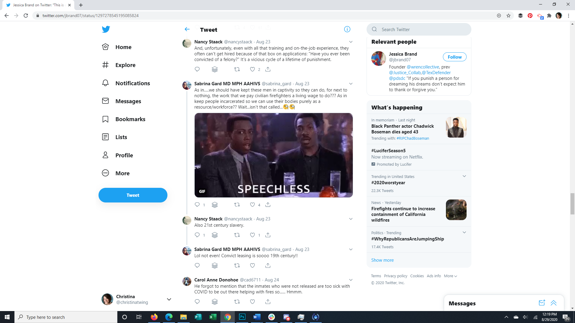 In an effort to slow the spread of Covid-19 incarceration facilities across the nation have released a small number of people earlier than they would have been otherwise. This has created a unique situation in California, a state that relies on prison labor to combat wildfires every year. As the writer of this Tweet calls out, much of the general public and the nation's politicians believe "if you do the crime, you do the time" and feel this extends to using inmates for fighting fires.