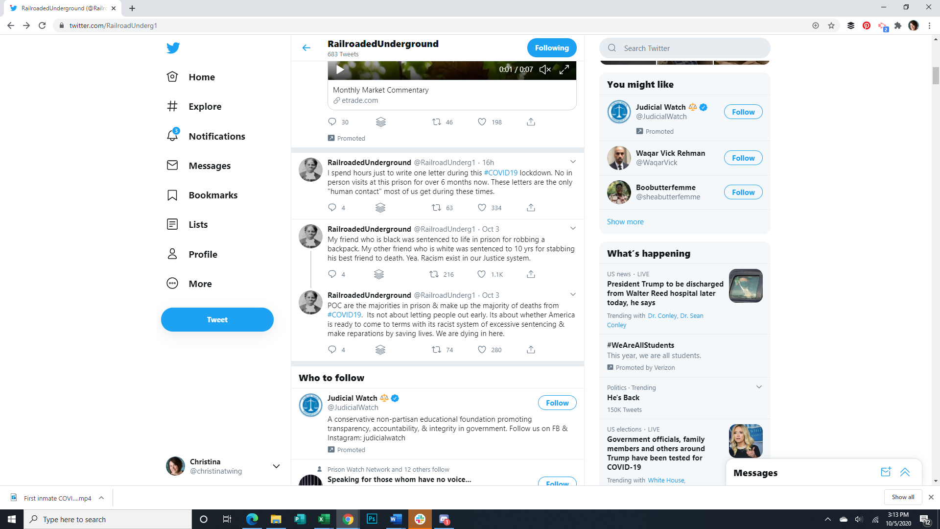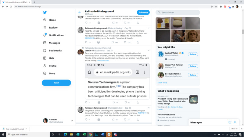These images show the Tweets of an incarcerated person utilizing a contraband cell phone to let the outside world know about prison conditions during the pandemic. This week he talks about the ability of incarcerated people to vote would cause them to be treated better, living like a caged animal, lockdown, going outside, mental health, watching presidential debates in prison, a second Covid outbreak happening in his prison, how important family connection is, incarcerated people are eligible for a stimulus check, people of color being the majority of incarcerated people and the majority of Covid deaths, difference of sentencing of white and black people,