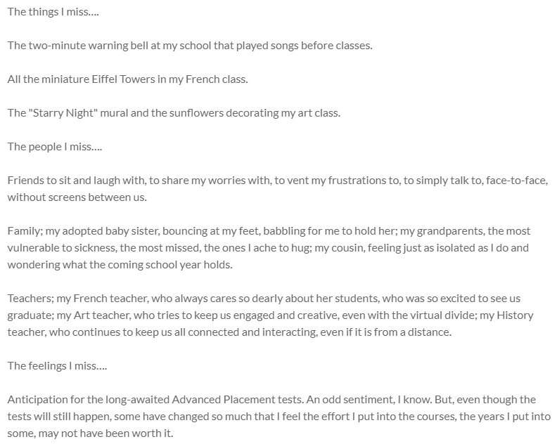 Teachers; my French teacher, who always cares so dearly about her students, who was so excited to see us graduate; my Art teacher, who tries to keep us engaged and creative, even with the virtual divide; my History teacher, who continues to keep us all connected and interacting, even if it is from a distance.