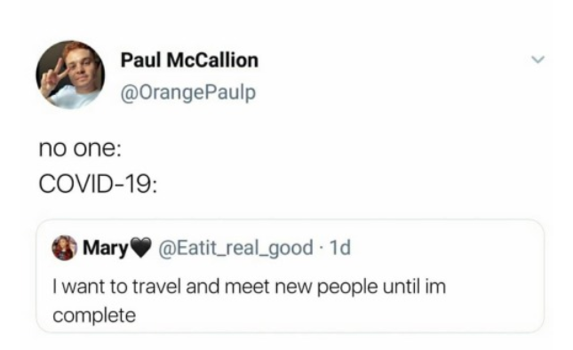 A tweet joking about the spread of covid-19 being like young women who feel they need to travel to find themselves.