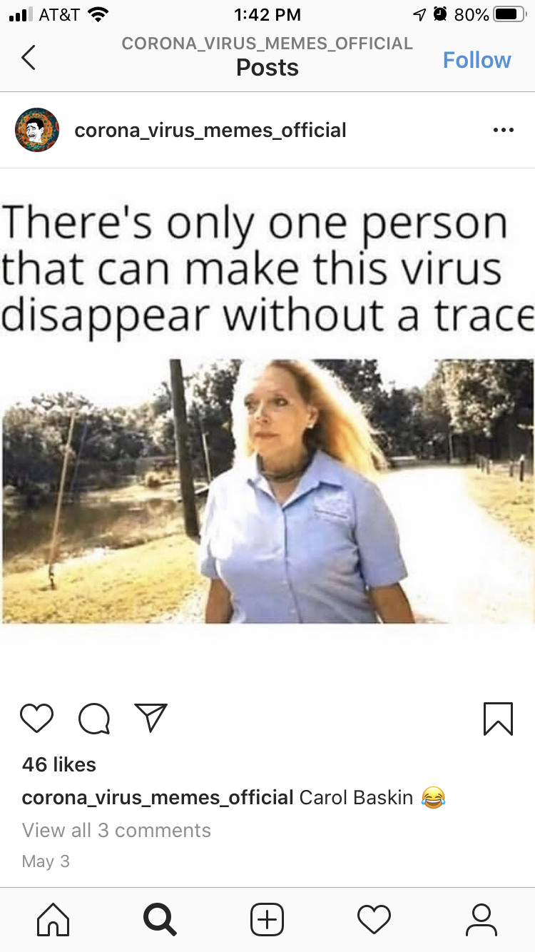 This meme both encompasses the time of the corona virus and the Netflix original series "Tiger King" documentary that became popularized during this time. Carol Baskin is accused of killing her husband without a trace in the show and is hilariously seen as the only person who can get rid of the virus.