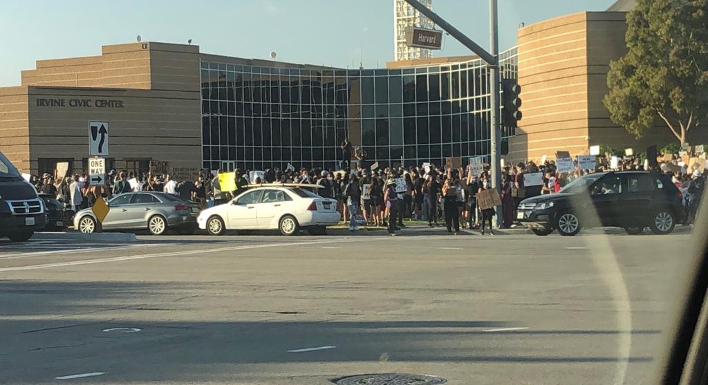 Group of peaceful protesters at Irvine Civic Center on June 3rd, 2020 following the murder of George Floyd. Most protesters were wearing masks but social distancing was not observed.