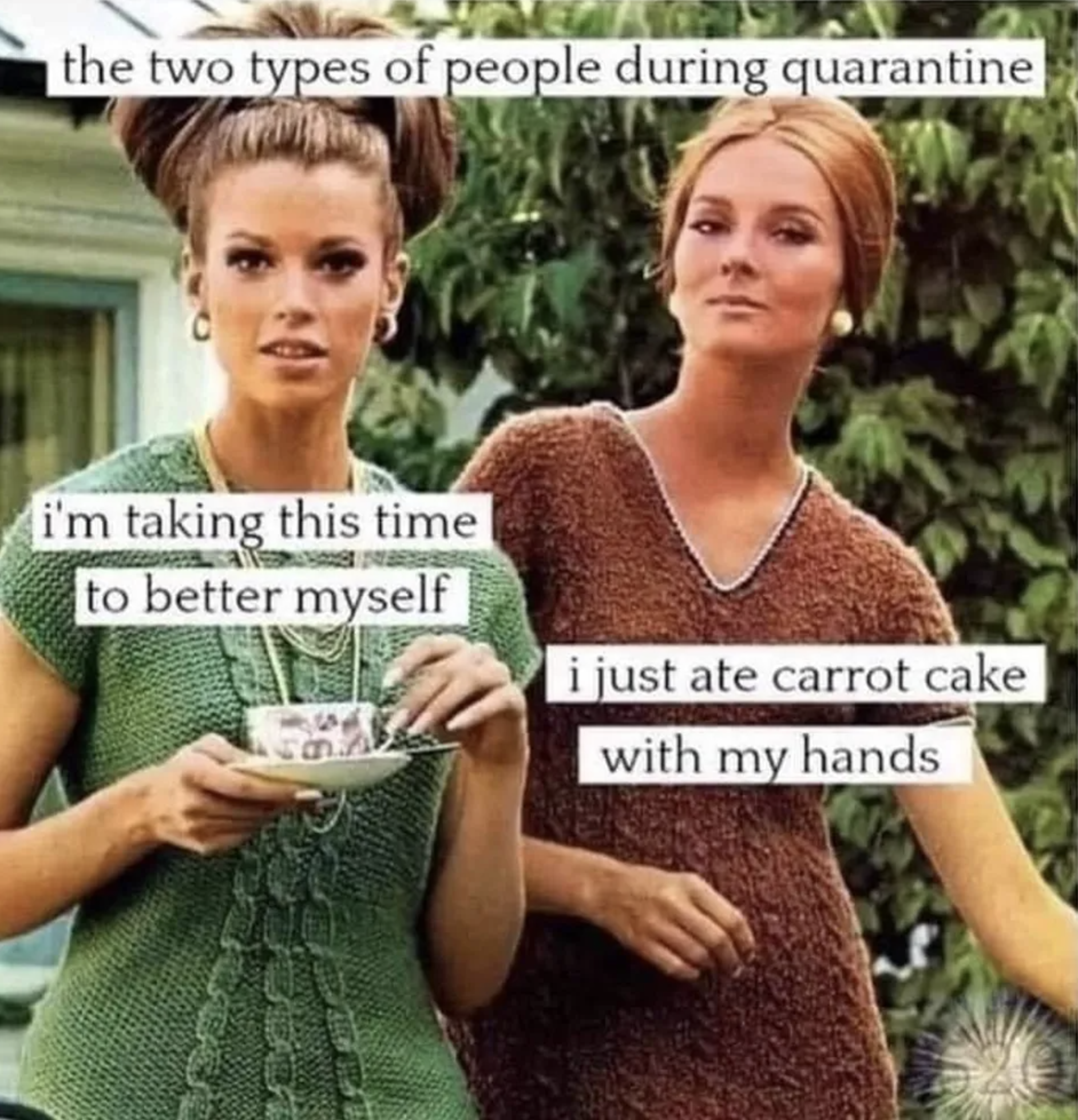 This meme shows how people will use their time during this pandemic while staying home. Some people will binge-eat, some will focus on themselves and improve them.