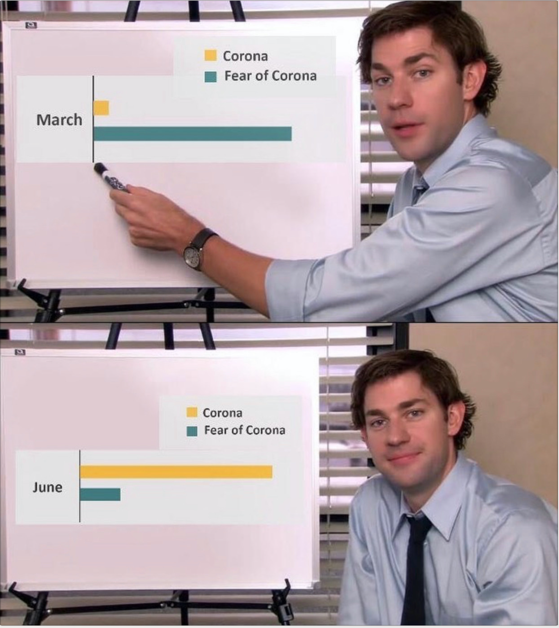 A meme that describes how people started to normalize the pandemic after some months in isolation.
