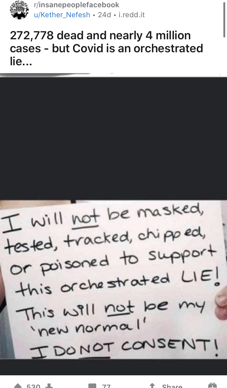 This skeptic believes COVID-19 is a conspiracy to allow testing, tracking, poisoning, and chipping. This person refuses to also wear a mask, believing masks to be part of the conspiracy. The person who shared this post on http://reddit.com/r/insanepeoplefacebook sarcastically states amount of people already dead to refute the conspiracy claim.