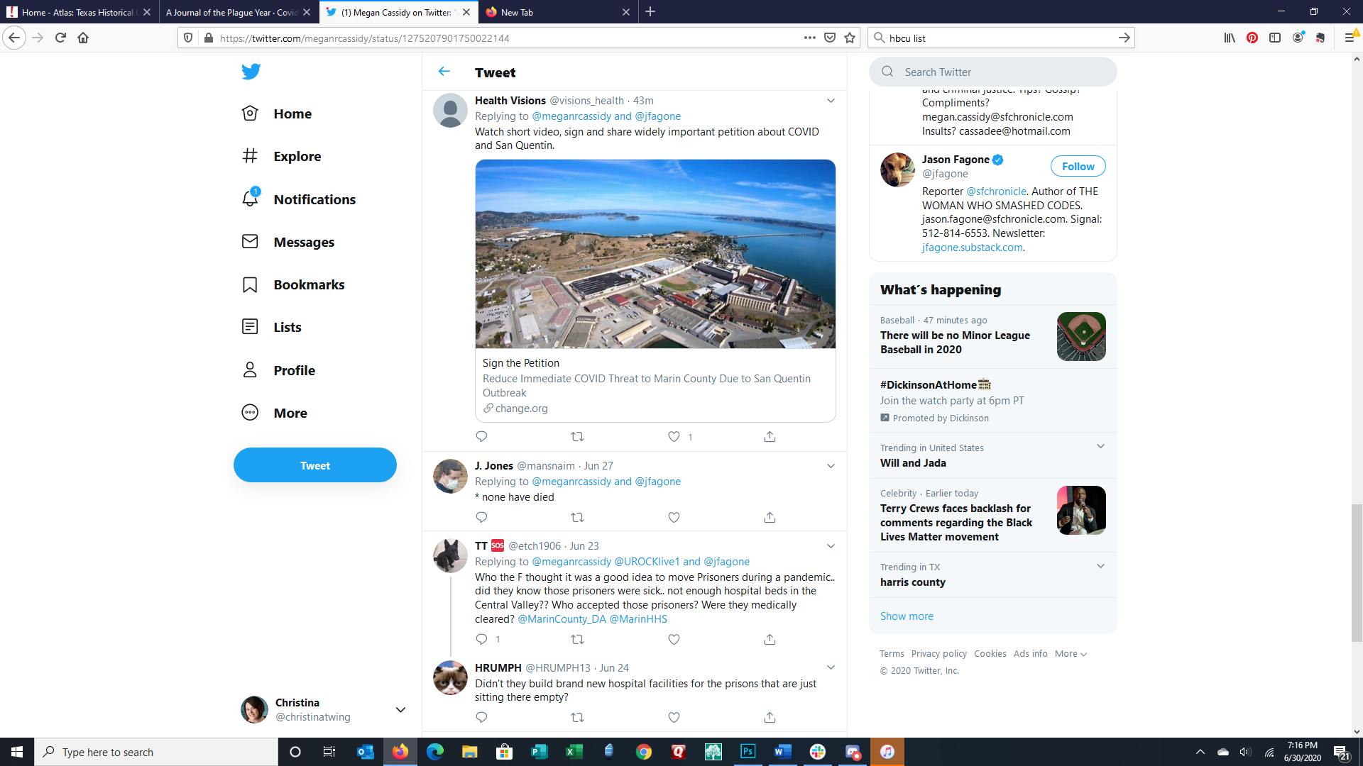 This is a Twitter (social media) post discussing the large outbreaks of covid-19 within U.S. correctional facilities. The Tweet and responses reference a news article and online petition also linked to this.