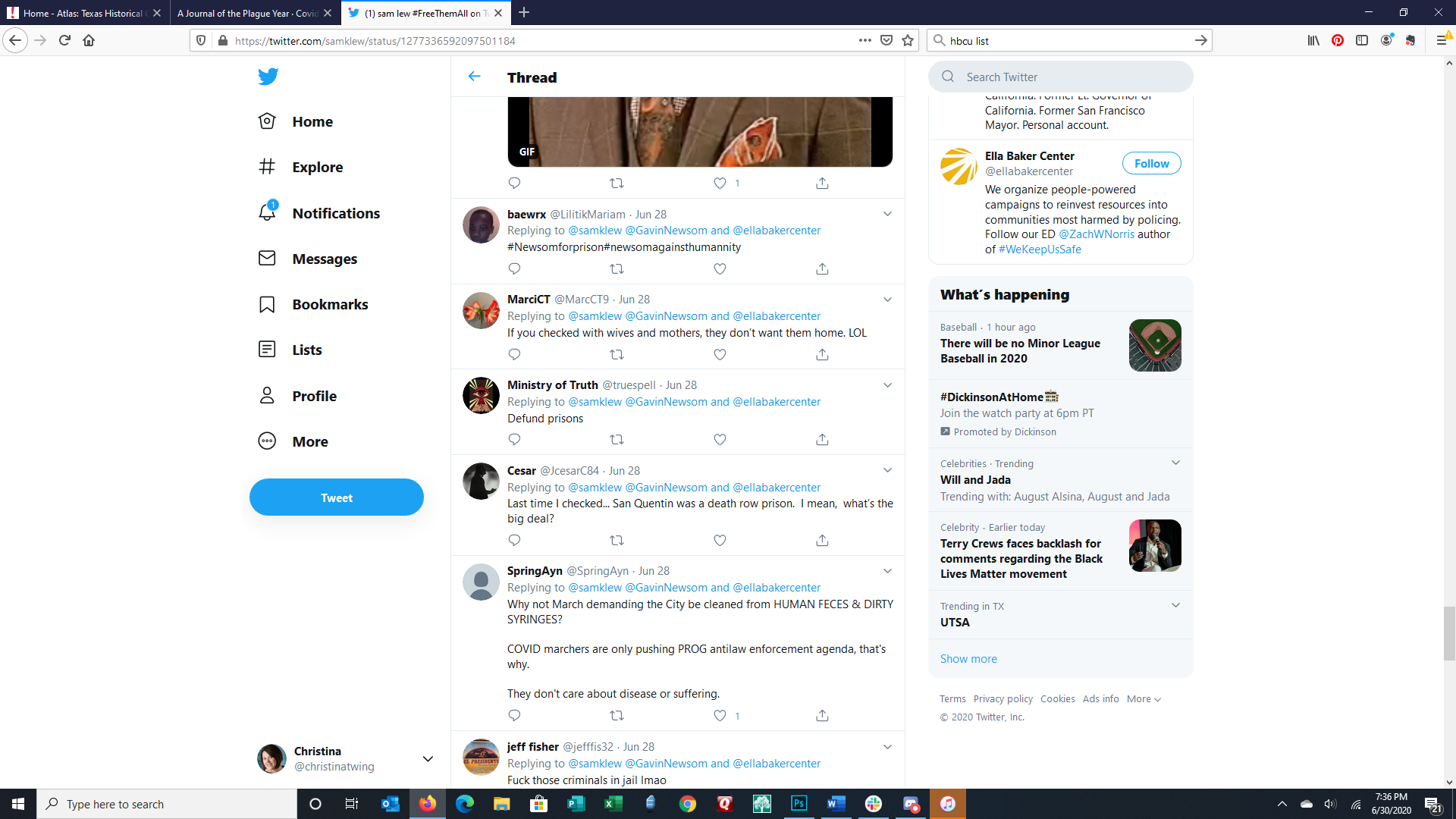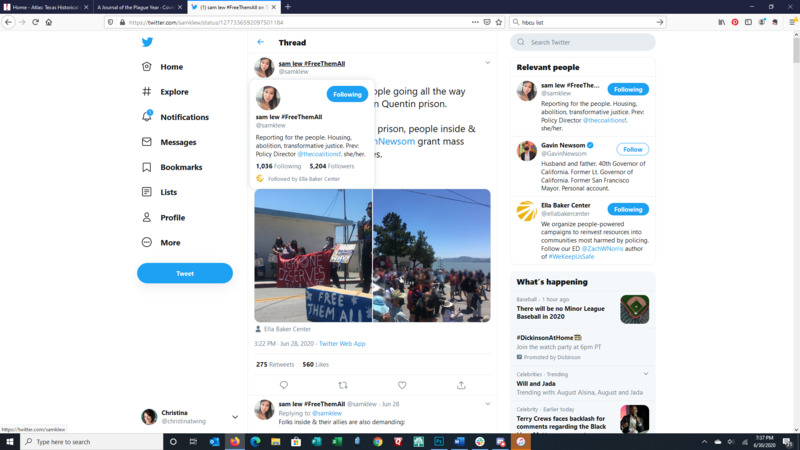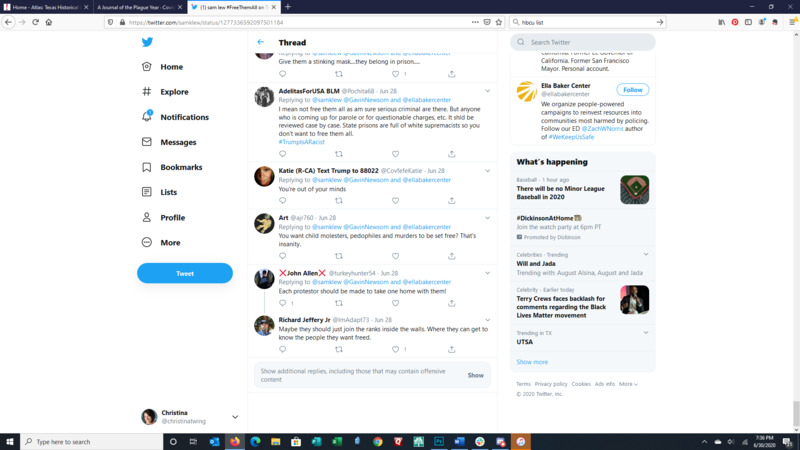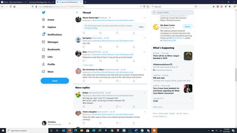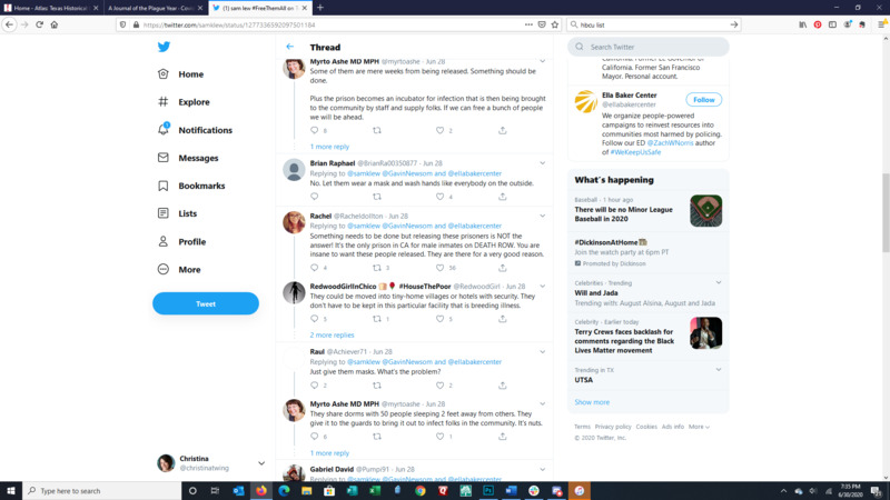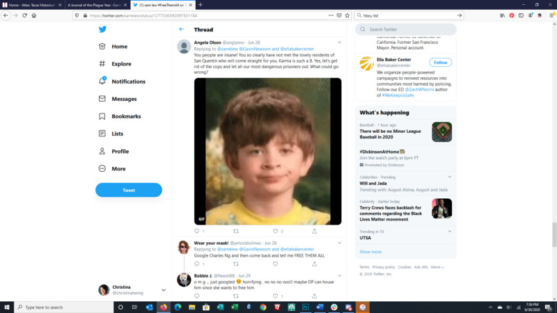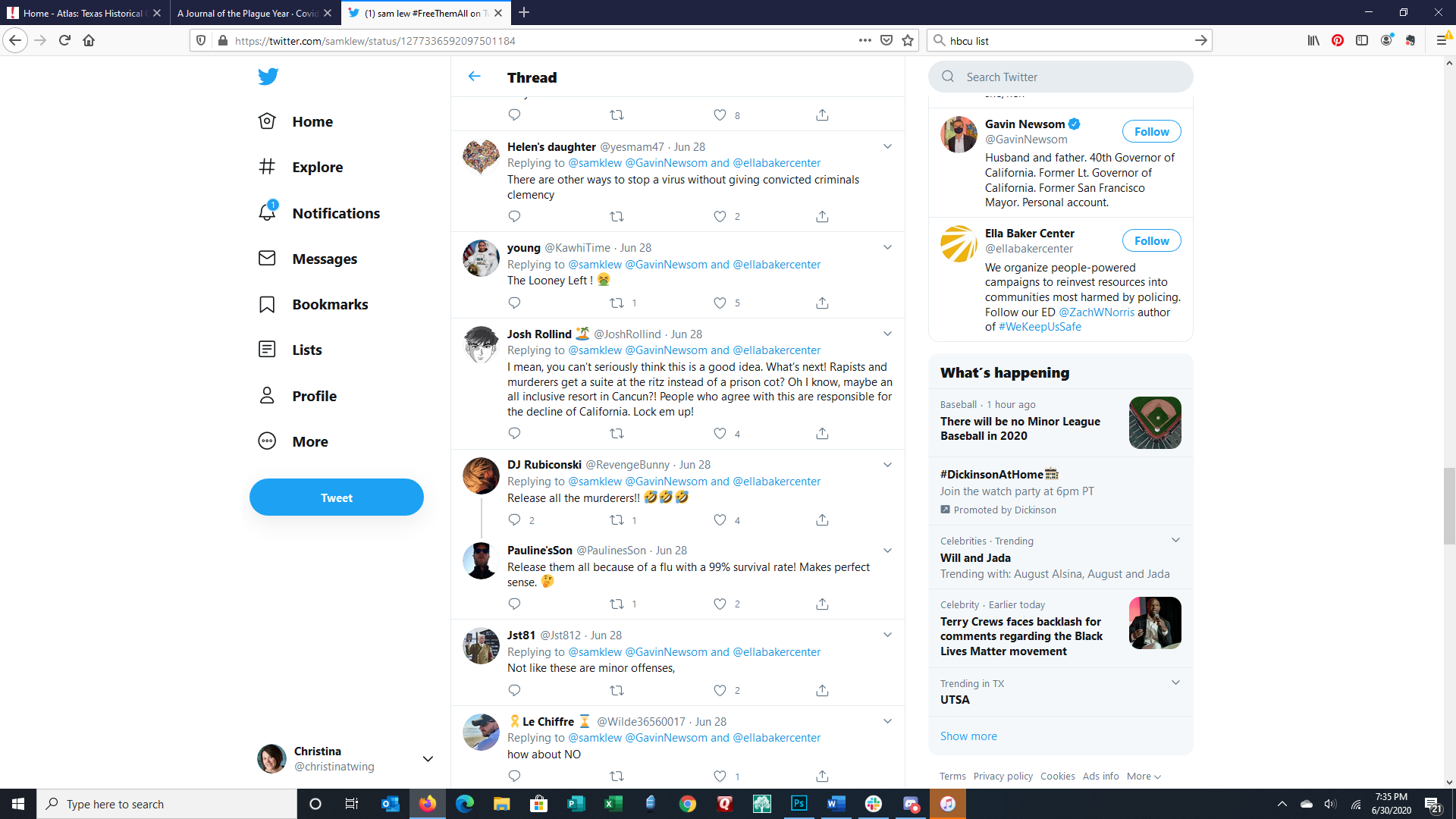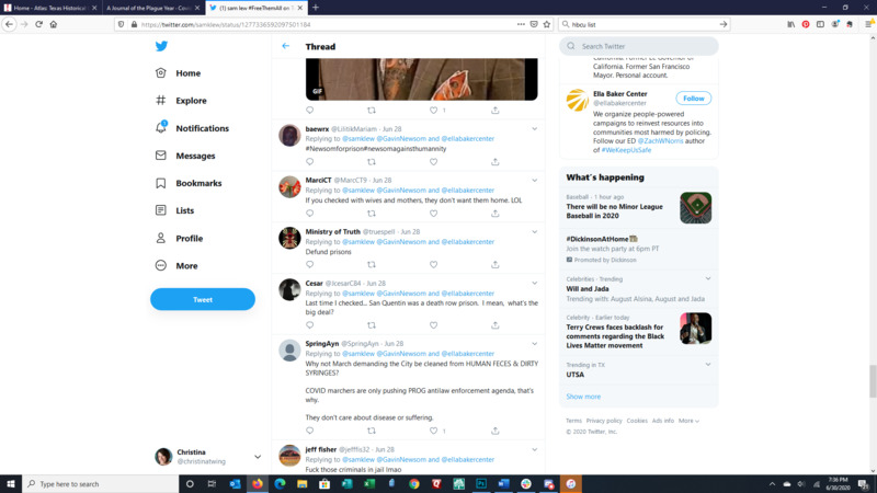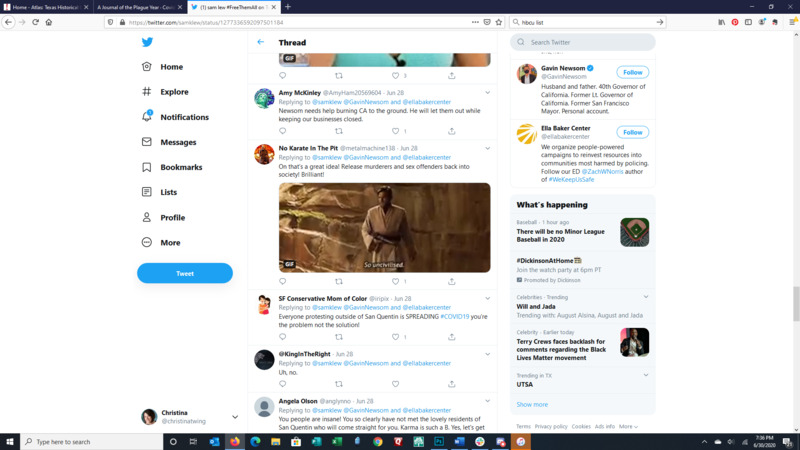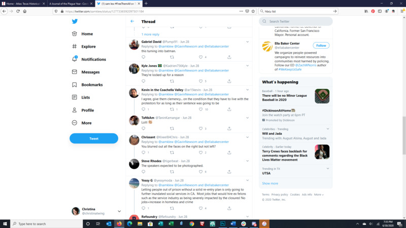 This is a Twitter post (social media) and the responses it received about a protest urging California governor Gavin Newsom to give early release to inmates to protect them from contracting covid-19. Here is a link to an article referenced in the thread https://www.orlandomedicalnews.com/article/3545/letter-to-the-editor-why-increasing-number-of-cases-of-covid-19-is-not-bad-news