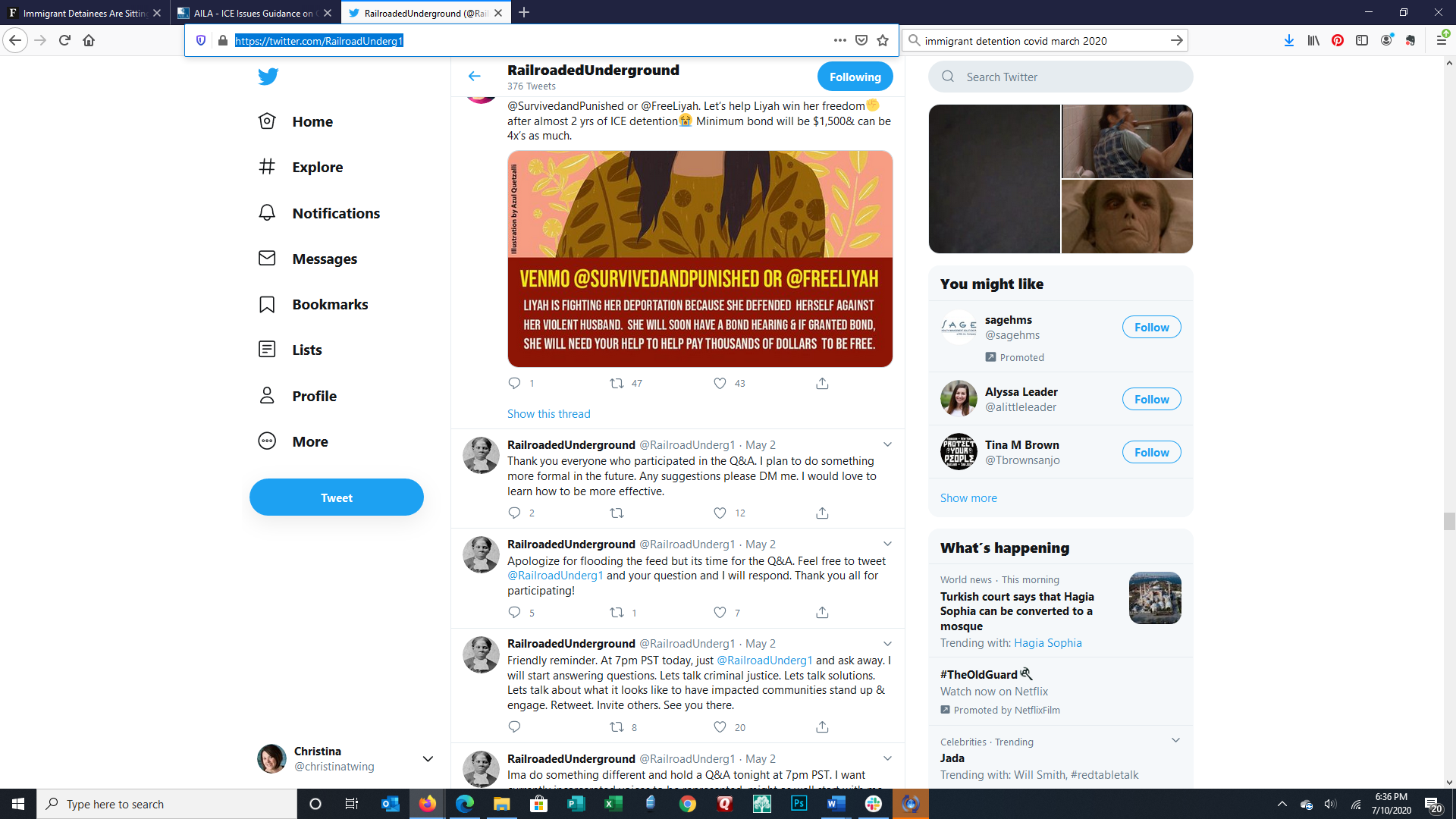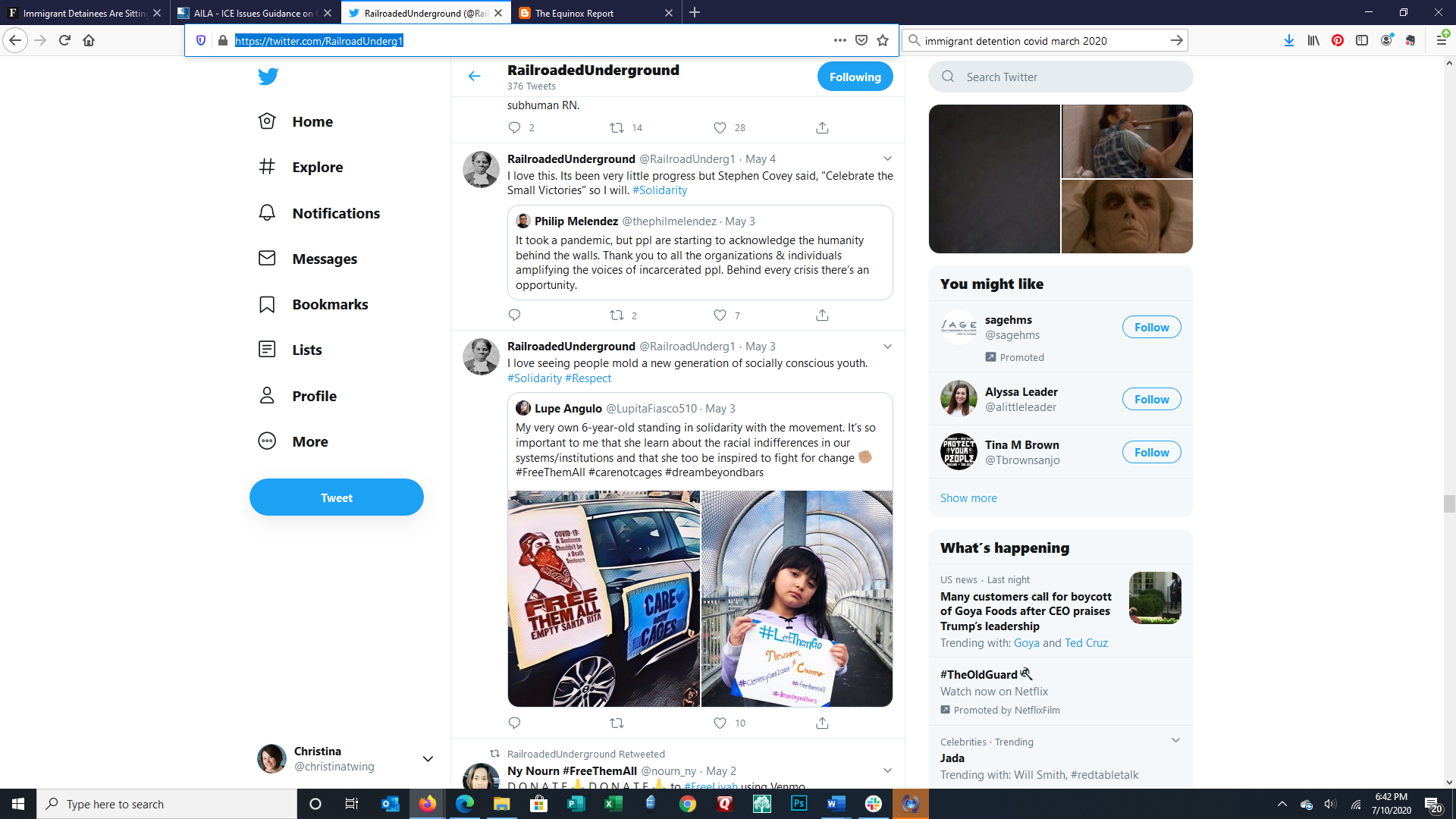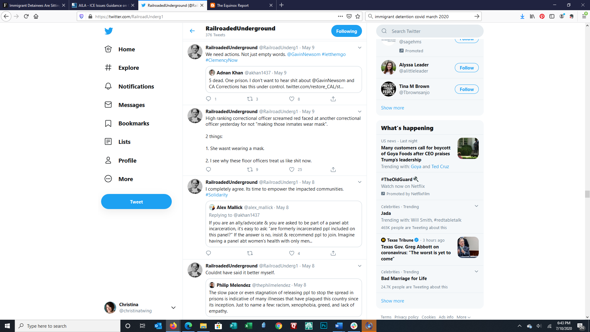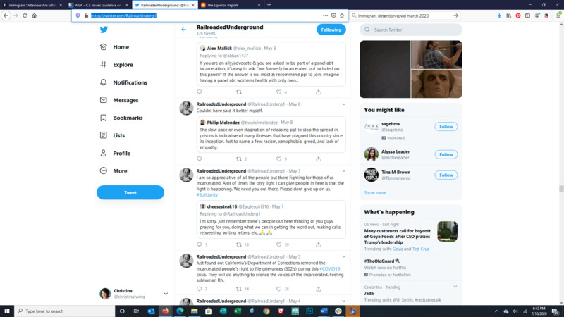 These images are of the Twitter feed of an incarcerated person using a contraband cellphone to tell the world what is happening inside the prison during the covid pandemic. This week they discuss guards still not wearing masks but inmates are required to, retweeted about #dreamers and #carenotcages, the public beginning to recognize the humanity inside of prisons, empowerment, #clemancynow, the state of California disallowing inmate grievances to be filed, stagnation of the movement to release inmates early to slow the spread, and the fight for their rights.