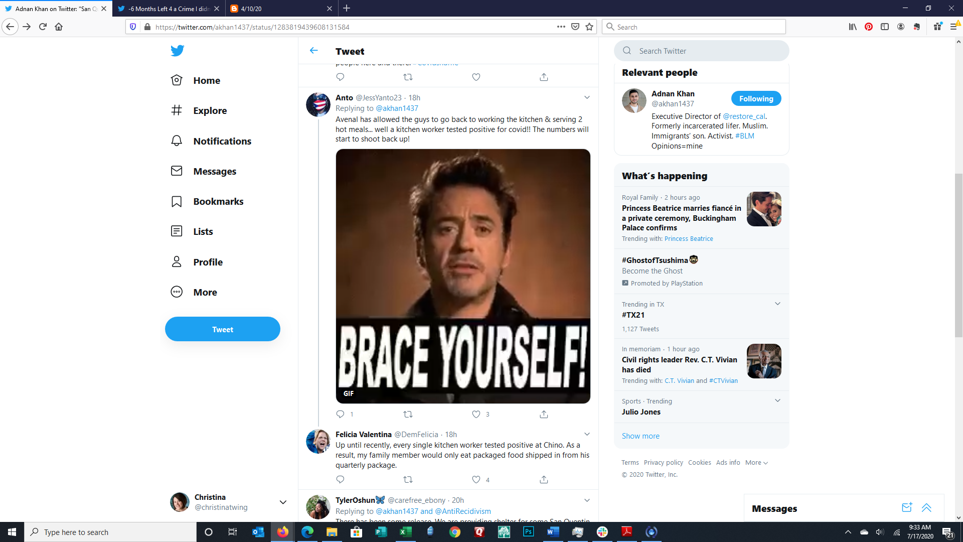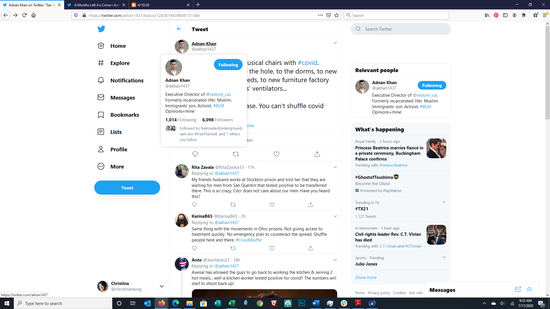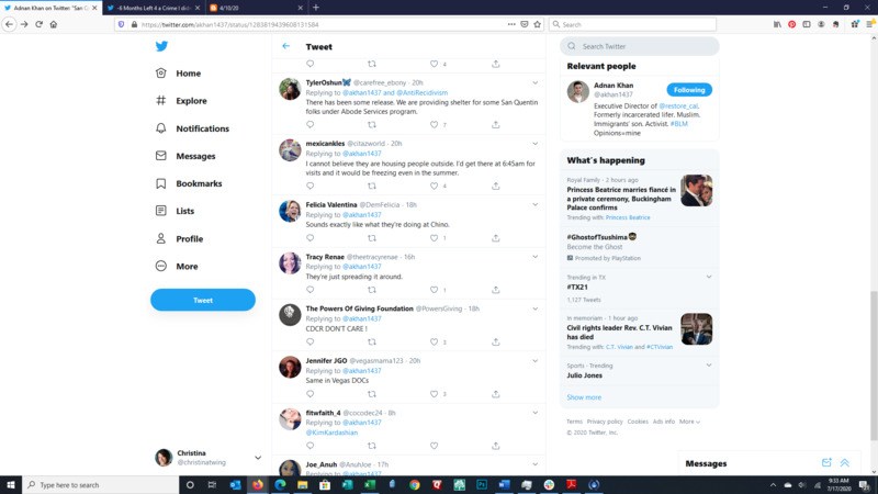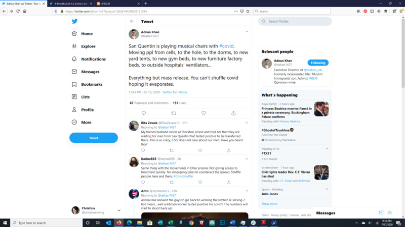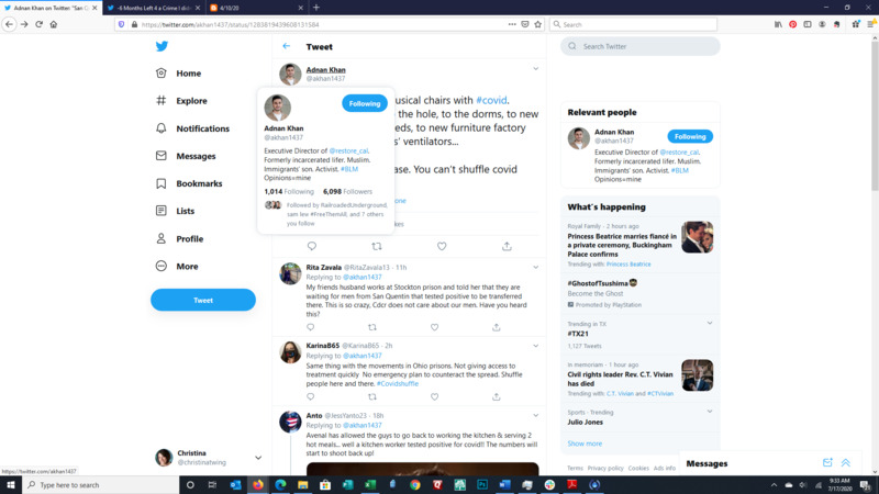 These images show the Tweet of Adnan Khan, a formerly incarcerated person and activist. Adnan explains that corrections facilities are moving people all over the prison and between facilities. The result is spread of the corona virus when the officials are charged with slowing the spread.