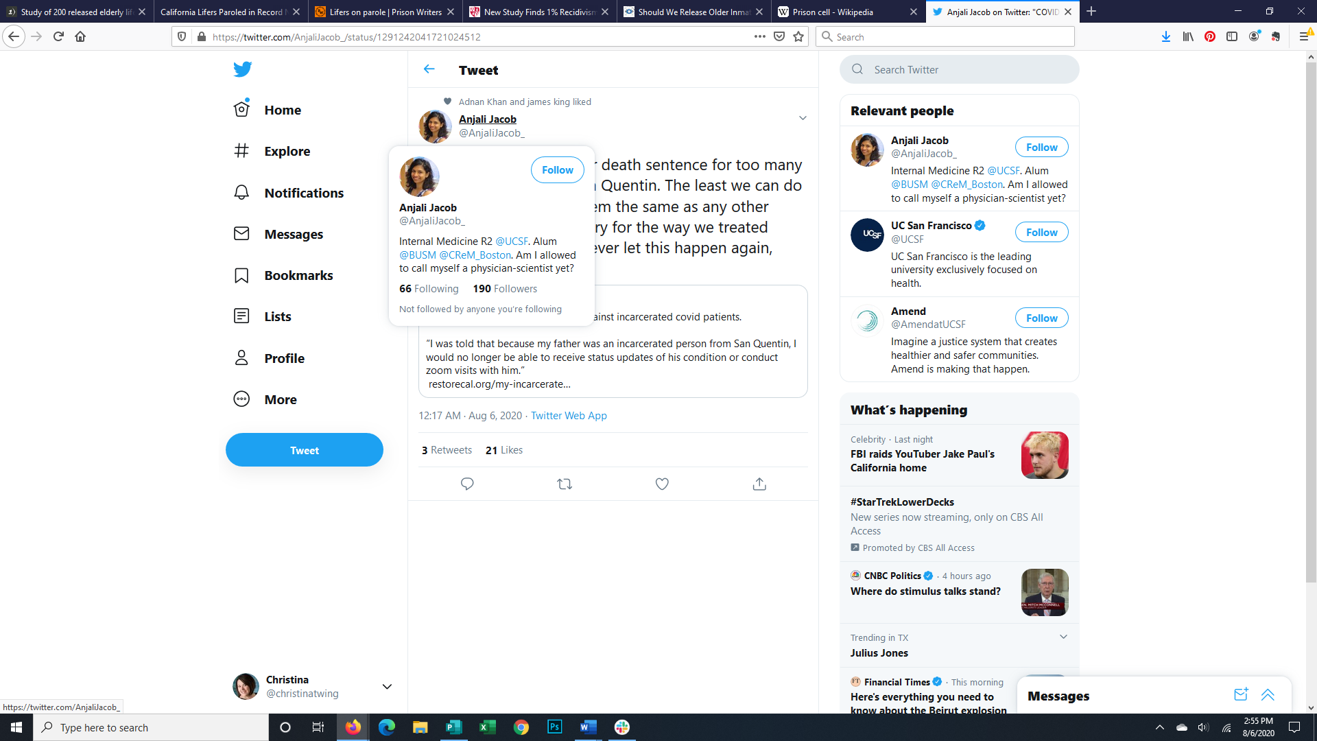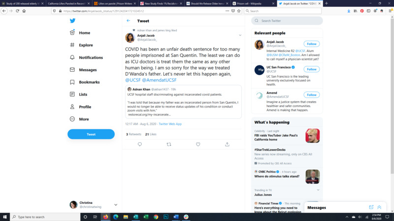 This is the image of a Tweet from a physician expressing her sorrow over the death of an incarcerated person and her belief that incarcerated persons with Covid deserve the same care as anyone else.