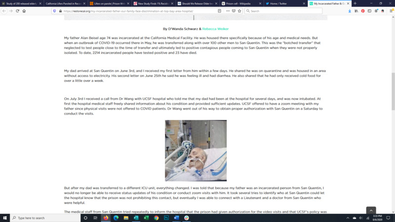 A 74 year old man who was incarcerated in a medical facility was transferred to San Quentin in an effort to keep him away from Covid, but the botched transfer resulted in the opposite. He contracted Covid and was sent to a local hospital. While there the medical staff facilitated Zoom calls and the like with his family. After being transferred to the ICU the medical staff said because he was incarcerated they could not facilitate contact with his family. His daughter explains more.
