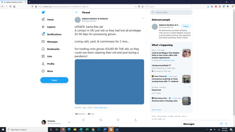 This Tweet explains that inmates who save gloves, given to them by the prison, have received disciplinary action for having the gloves.