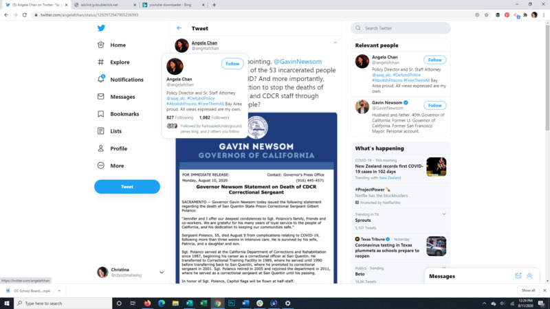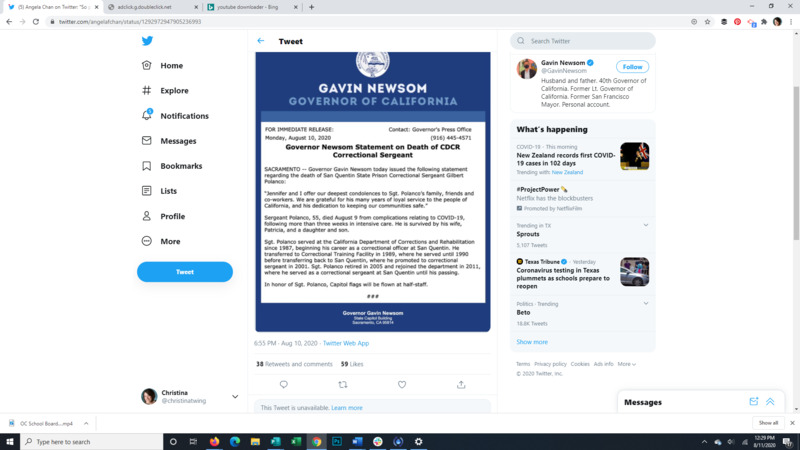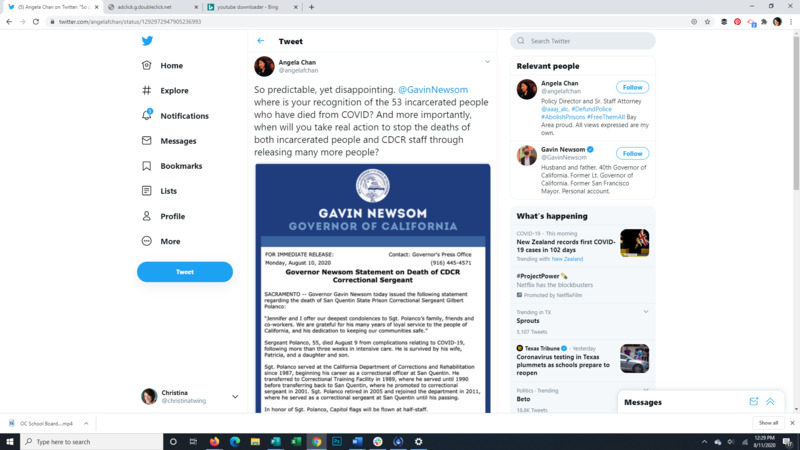 This Tweet expresses the lack of concern for the incarcerated people dying from Covid 19. California Governor Gavin Newsom expresses his sympathy for the family and friends of one of the correctional facility staff who recently passed from complications due to Covid-19 but he does not mention the many people incarcerated in these facilities who have also died from Covid-19.