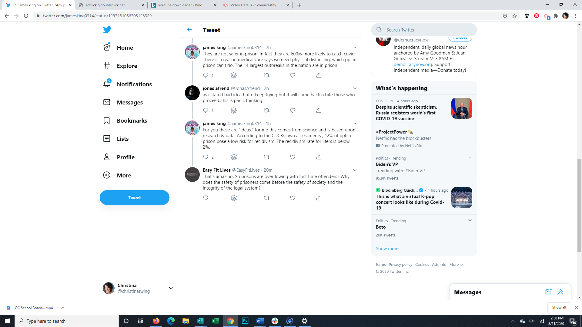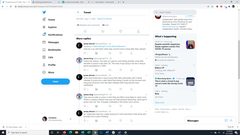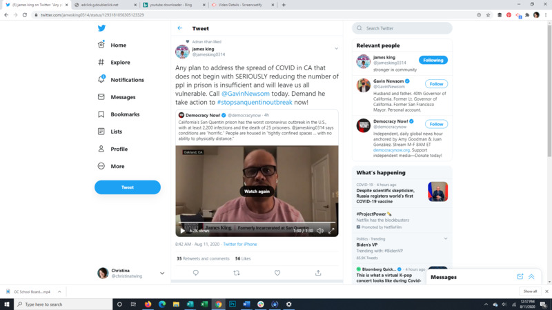 James King, formerly incarcerated and now a criminal justice activist, speaks out about the need to reduce the prison population to slow the spread of covid. He also explains the conditions at San Quentin Prison in California and in the replies to his Tweet explains and quotes the recidivism rates for prisoners.