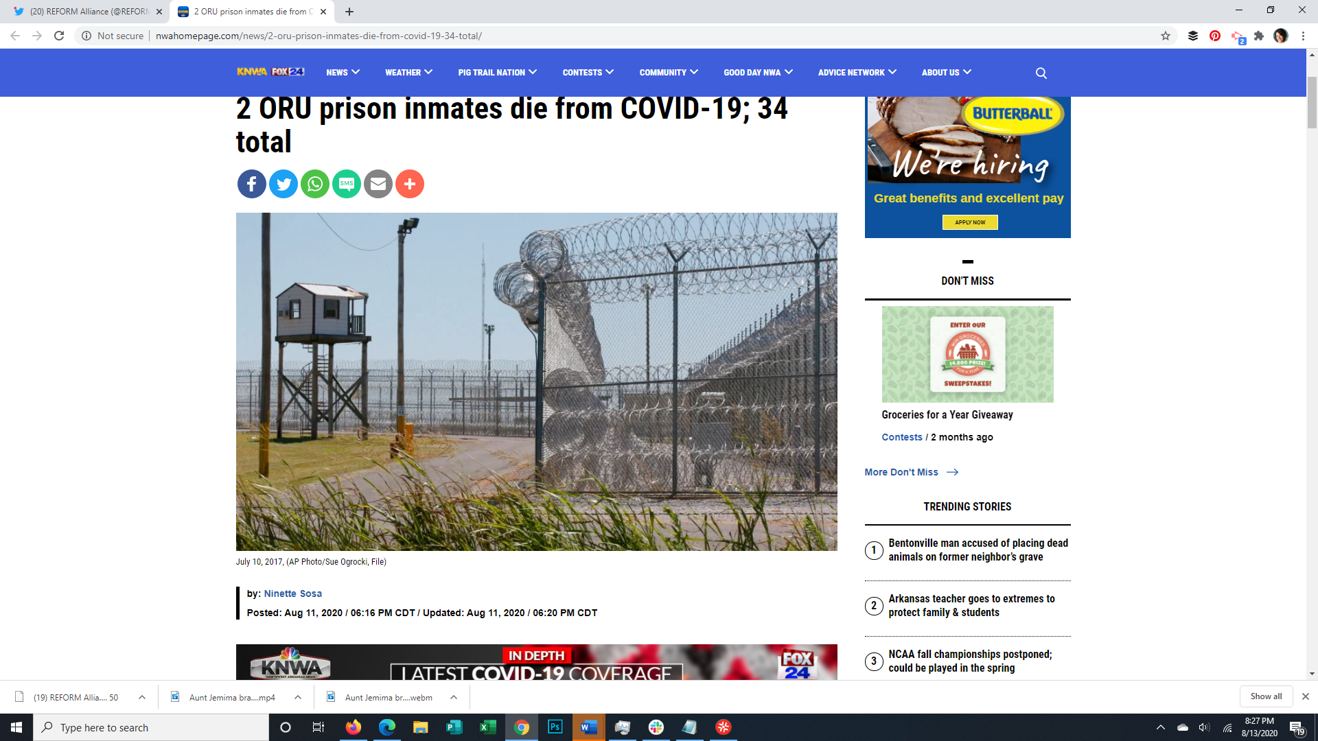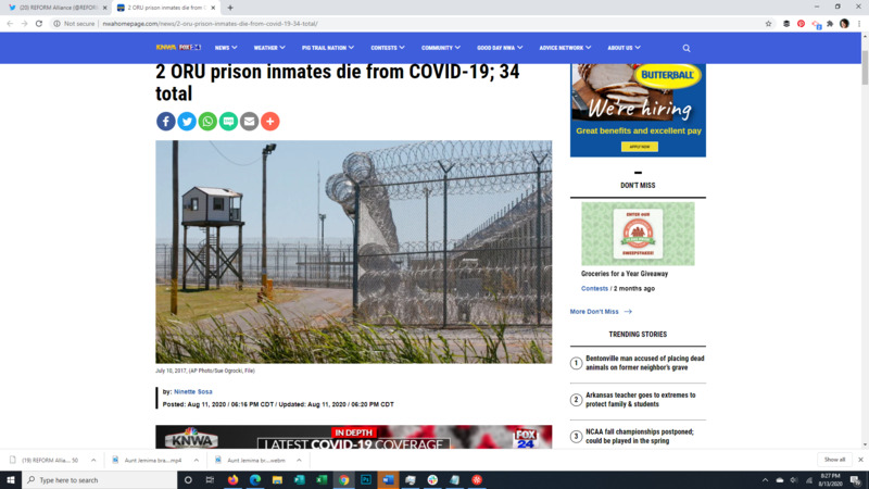 Two more people incarcerated at Arkansas state prisons have died from the Coronavirus, bringing the total deaths from the virus to thirty four. They also have 800 active cases.