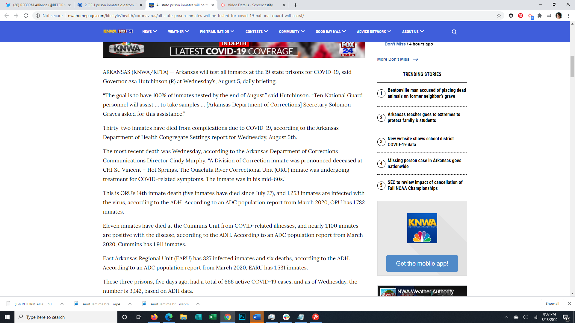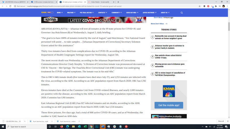 On August 5th, Arkansas Governor Asa Hutchinson announced a plan to test all of the people incarcerated at the 19 state prisons. As of the press conference 10 of the facilities had already been tested and the remaining 9 would be completed by the end of August. To help with this 10 National Guard personnel will be assisting.