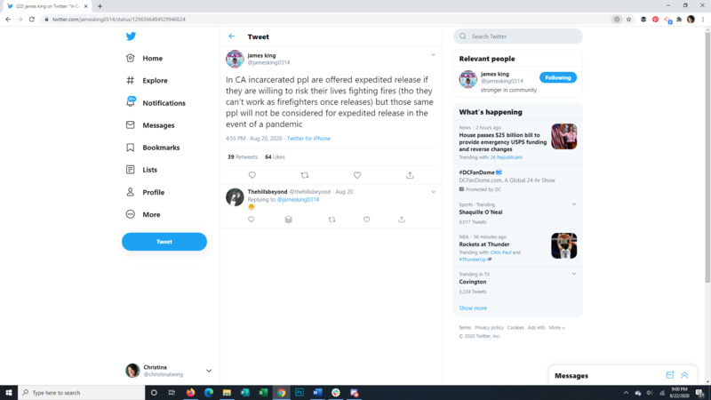This Tweet shows that while California depends on prison labor for their wildfire firefighting, these same people are not eligible to work as firefighters once they are released from incarceration.
