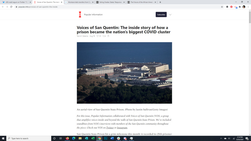 This article was co written by Popular Information and Voices of San Quentin. It explains how a major California state prison managed to stave off covid-19 until inmates from another prison were transferred into the facility. . . and they were carrying covid, what they did to deal with the outbreak, and how it effected incarcerated persons.