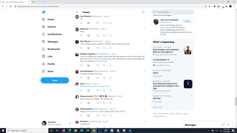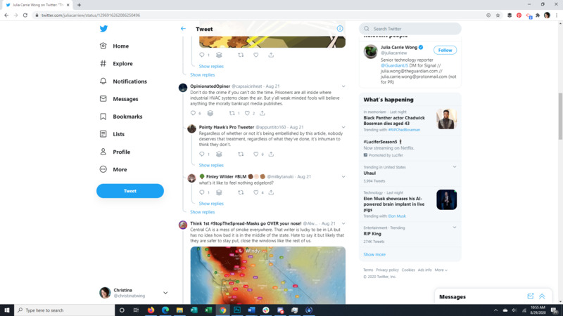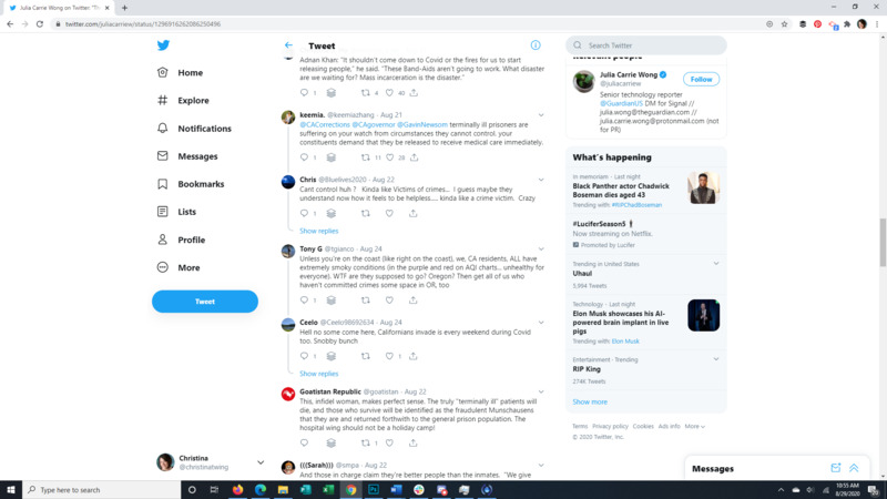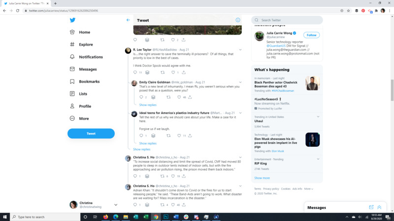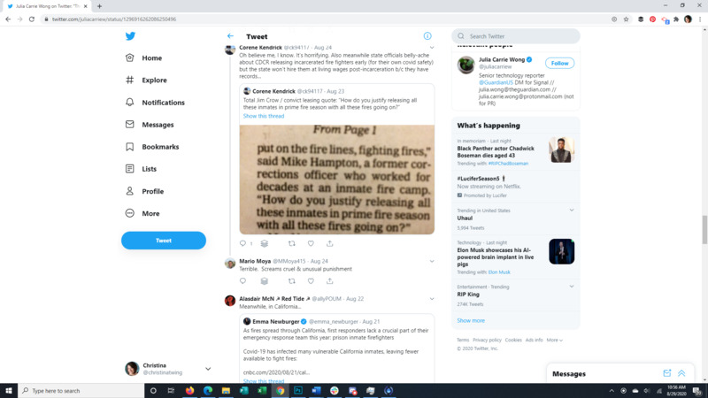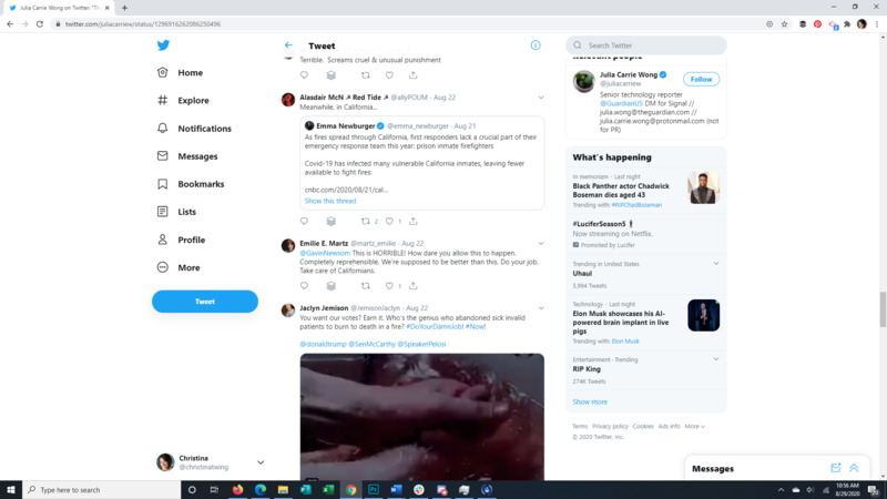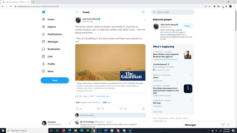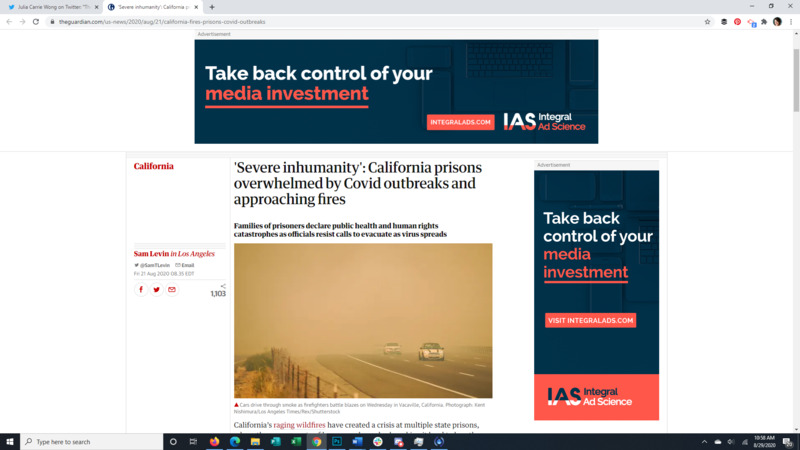 This Tweet and article concern the conditions inmates in California's prisons are experiencing. First they had to deal with Covid-19 and figure out how to slow the spread of the disease within overcrowded facilities where social distancing is impossible and mask wearing presents its own set of issues. Second incarcerated people are living in a near constant state of lockdown, visitation and even communication with family and friends is gone. Third they are facing the threat of wildfires within a few miles of several prisons causing the people inside the buildings to breath air filled with smoke. To add insult to injury the state of California uses prison labor to fight these same fires.