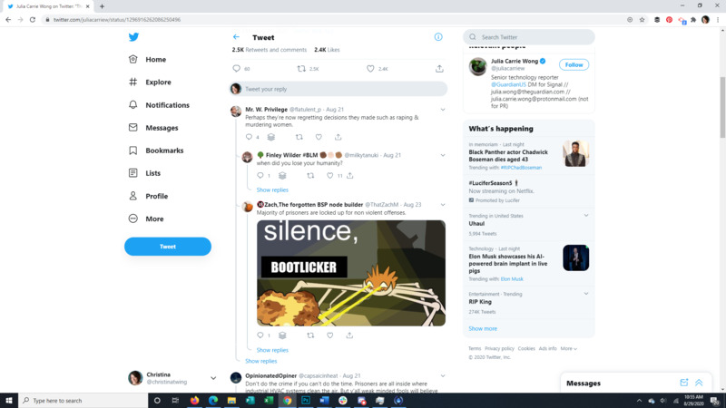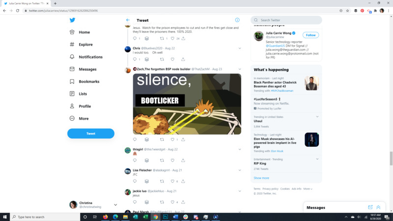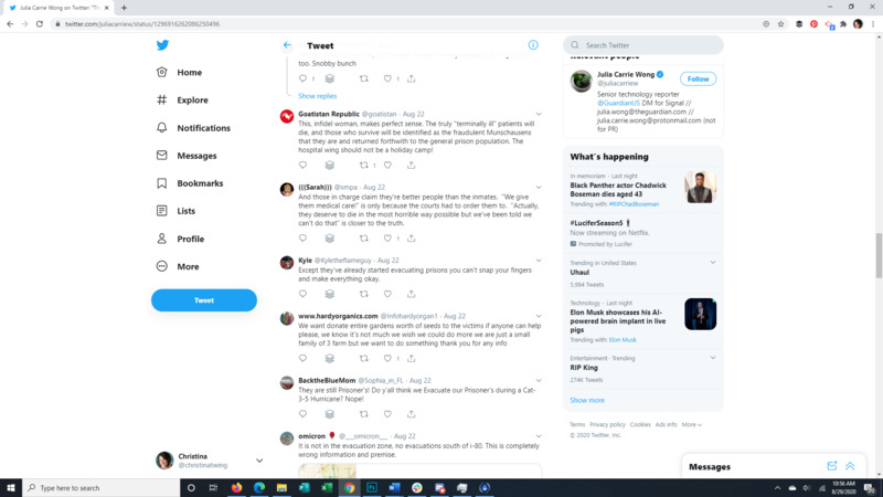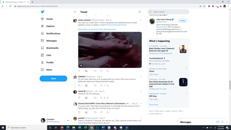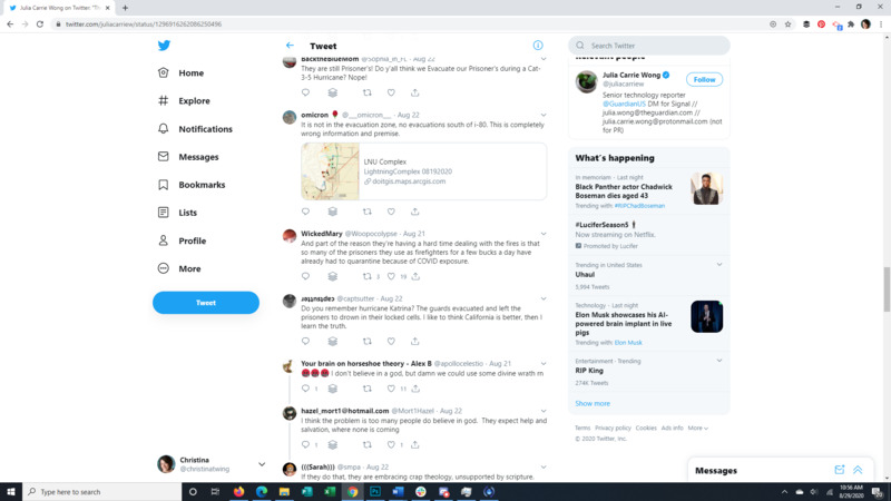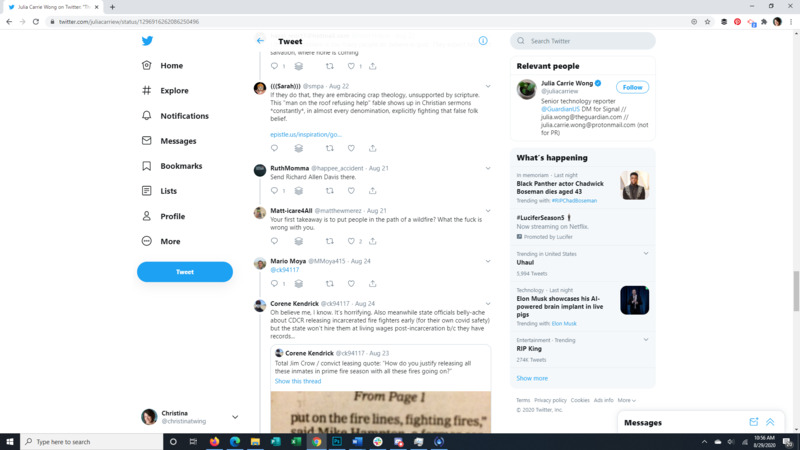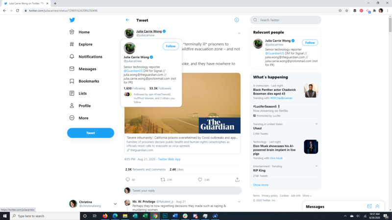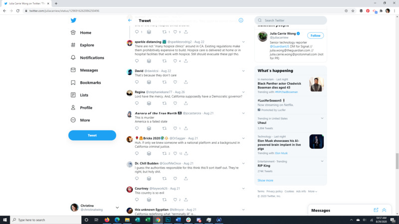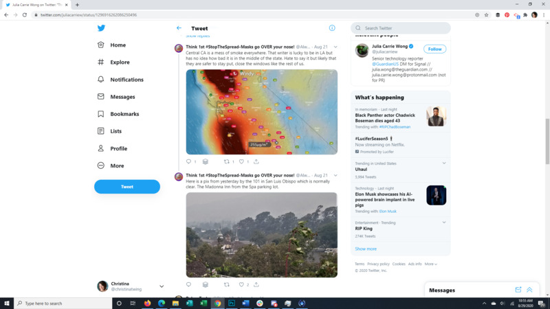 This Tweet and article concern the conditions inmates in California's prisons are experiencing. First they had to deal with Covid-19 and figure out how to slow the spread of the disease within overcrowded facilities where social distancing is impossible and mask wearing presents its own set of issues. Second incarcerated people are living in a near constant state of lockdown, visitation and even communication with family and friends is gone. Third they are facing the threat of wildfires within a few miles of several prisons causing the people inside the buildings to breath air filled with smoke. To add insult to injury the state of California uses prison labor to fight these same fires.