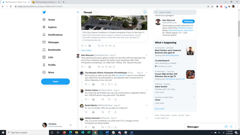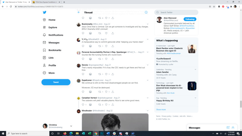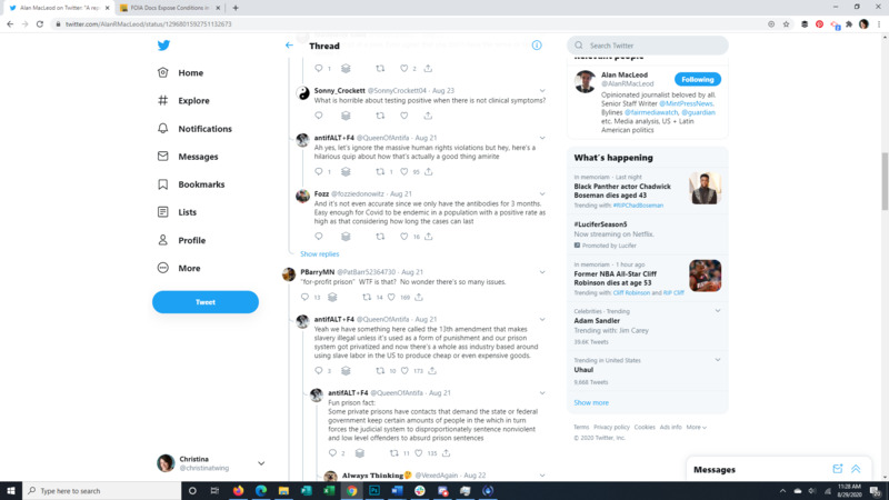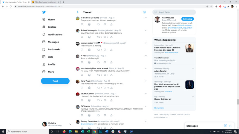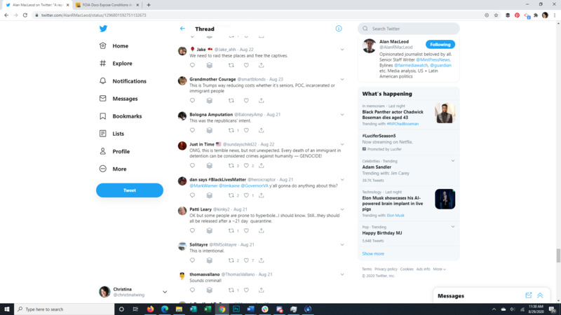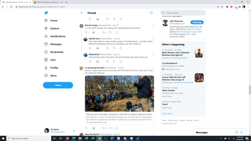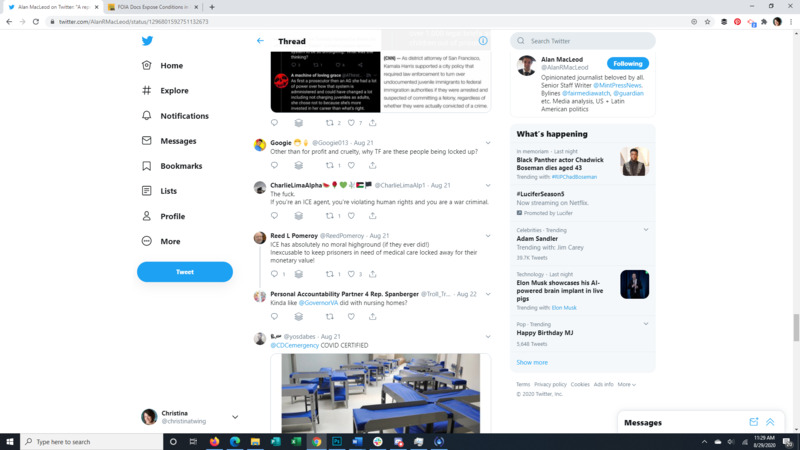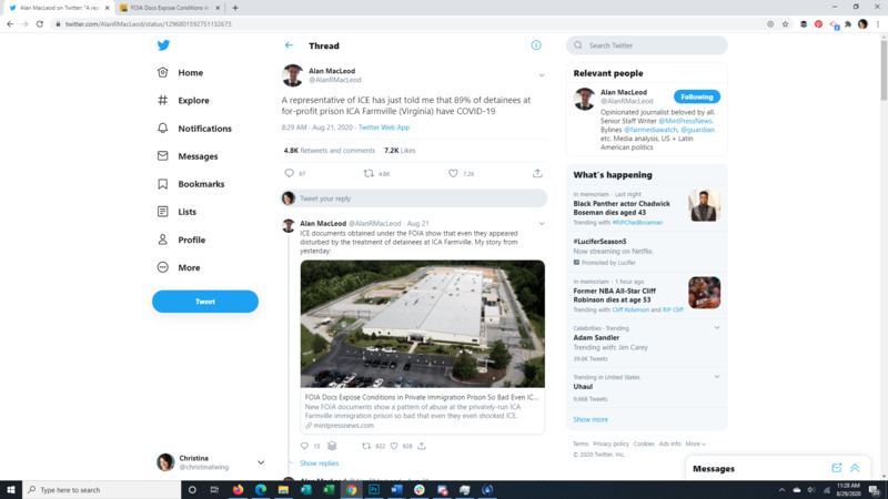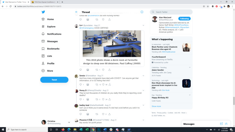 This Tweet brings to light that almost all detainees at the Farmville Detention Facility, a for profit prison in Virginia, have Covid-19. The attached article discusses long running complaints of mistreatment at this facility, some so egregious that even ICE itself was appalled. It also points to the spread of Covid through facility transfers all over the US. The replies to the original Tweet give a good representation of the American public's response to the situation.