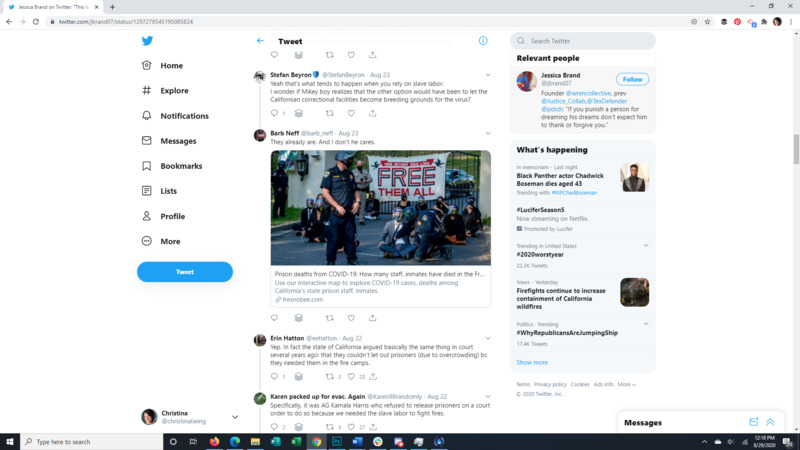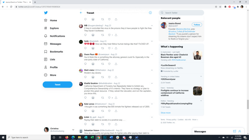 In an effort to slow the spread of Covid-19 incarceration facilities across the nation have released a small number of people earlier than they would have been otherwise. This has created a unique situation in California, a state that relies on prison labor to combat wildfires every year. As the writer of this Tweet calls out, much of the general public and the nation's politicians believe "if you do the crime, you do the time" and feel this extends to using inmates for fighting fires.