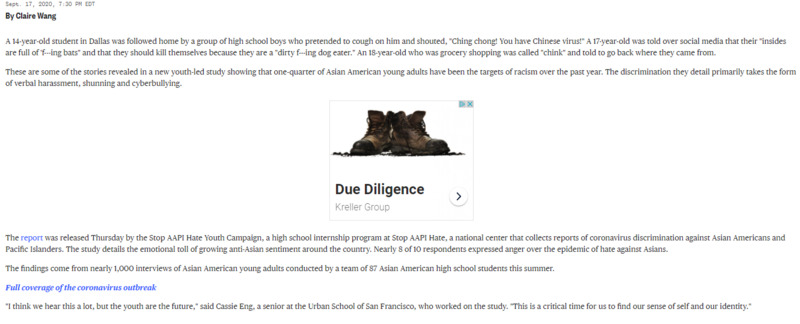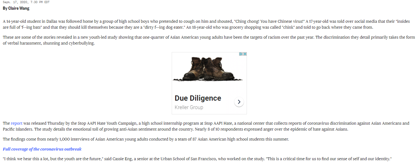 The Stop AAPI Hate Youth Campaign, which interviewed nearly 1,000 young Asian American adults across the country about their experiences with racism during the coronavirus pandemic found that 1 in 4 Asian American youths experience racist bullying. Discrimination in the form of physical and verbal attacks often also include questioning the identity of Asians as American, with statements such as "go back to where you came from."