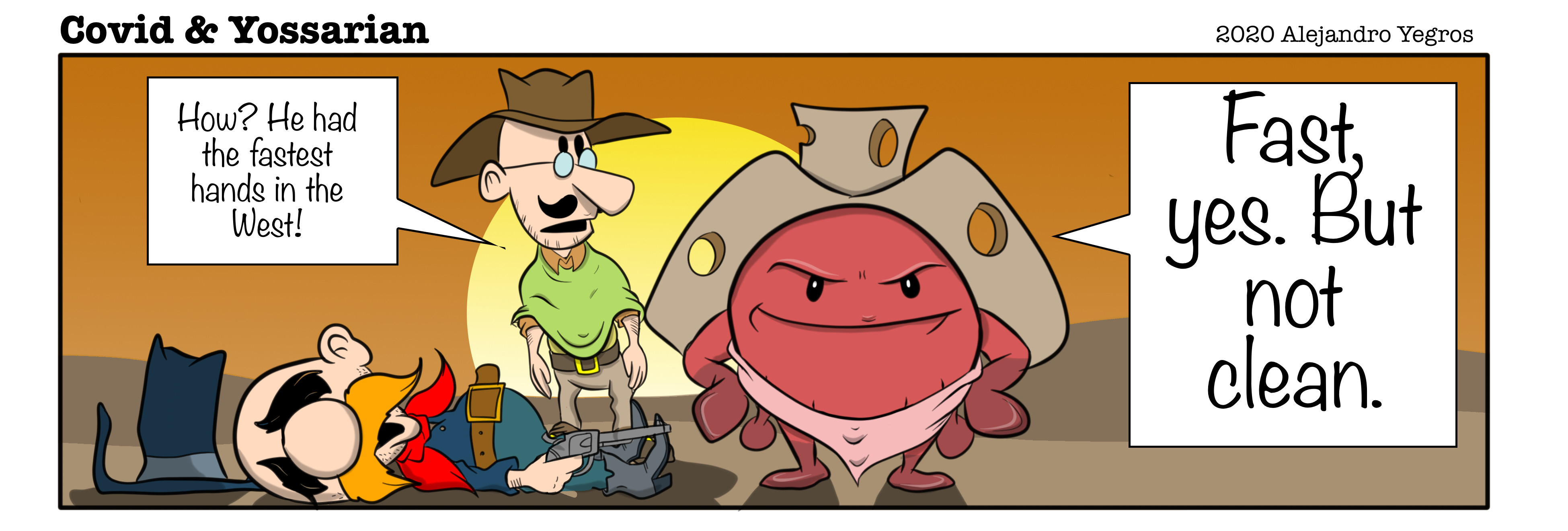 Alejandro Yegros shared the comics he created and then self-published. They were first shared on Tapas and Facebook, and the book is on Covidandyossarian.com. The comics were bulk uploaded and the dates were found on Tapas. EC 03/28/2022.